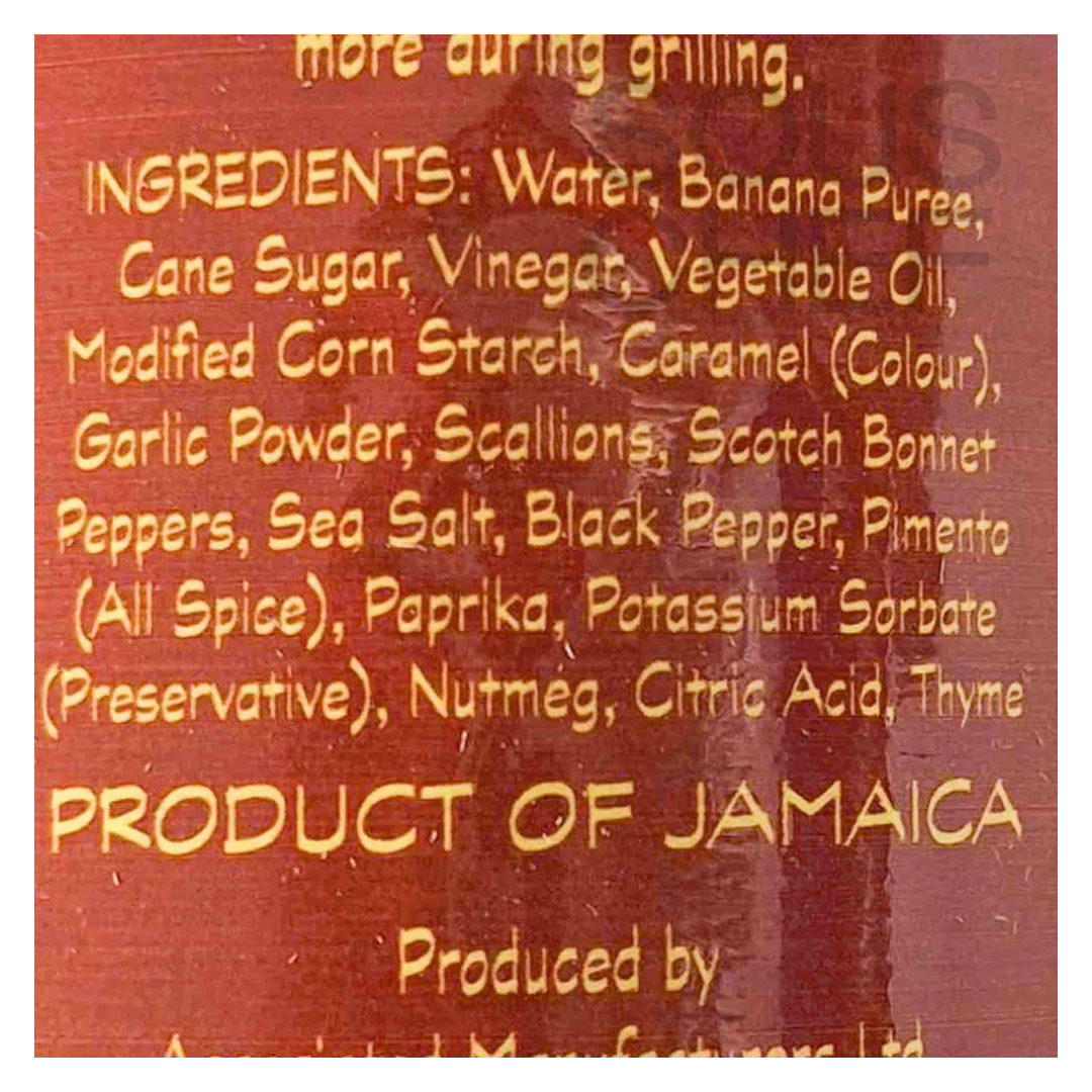 Ingredients: water, banana puree, cane sugar, vinegar, vegetable oil, modified corn starch, caramel (colour), garlic powder, scallions, scotch bonnet peppers, sea salt, black pepper, pimento (all spice), paprika, potassium sorbate (preservative), nutmeg, citric acid, thyme.